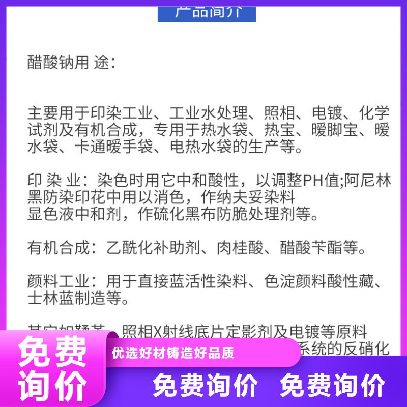 醋酸钠分类及应用 醋酸钠就形态可分为固体和液体两种,固体醋酸钠 C2H3NaO2含量≥58-60%,外观:无色或白色粉末/结晶。液体醋酸钠:含量≥20%,25%,30%。外观:清澈透明液体。感官:无刺激性异味,水不溶物:≤0.006%。醋酸钠就产品质量标准不同,可分为食品级、工业级等。 用途:污水处理厂使用乙酸钠作为补充碳源,对反硝化污泥进行驯化,可得较高的比反硝化速率。当前所有城市市政污水或工业废水处理想要达到排放一级A标准就需要添加醋酸钠/乙酸钠做碳源。 产品应用: 水处理行业:用作水处理碳源,Ph调节剂。 印染业:染色时用它中和酸性,以调整PH值;黑防染印花中用以消色,作纳夫妥染料显色液中和剂,作硫化黑布防脆处理剂等。 医药制剂:在碱性利尿剂、黄体酮甲状腺素、胱氨酸及甲碘吡酮酸钠等制造时用。 有机合成:乙酰化补助剂、肉桂酸、醋酸苄酯等。 颜料工业:用于直接活性染料、色淀颜料酸性藏、士林蓝制造等。其它如鞣革、照相X射线底片定影剂及电镀等原料。 食品行业:可作缓冲剂,缓和不良气味并防止变色改善风味时使用0.1%-0.3%。具有一定的防霉作用,如使用0.1%-0.3%于鱼肉糜制品及面包。亦可用作调味酱、酸菜、蛋黄酱、鱼糕、香肠、面包、黏糕等的酸味剂。